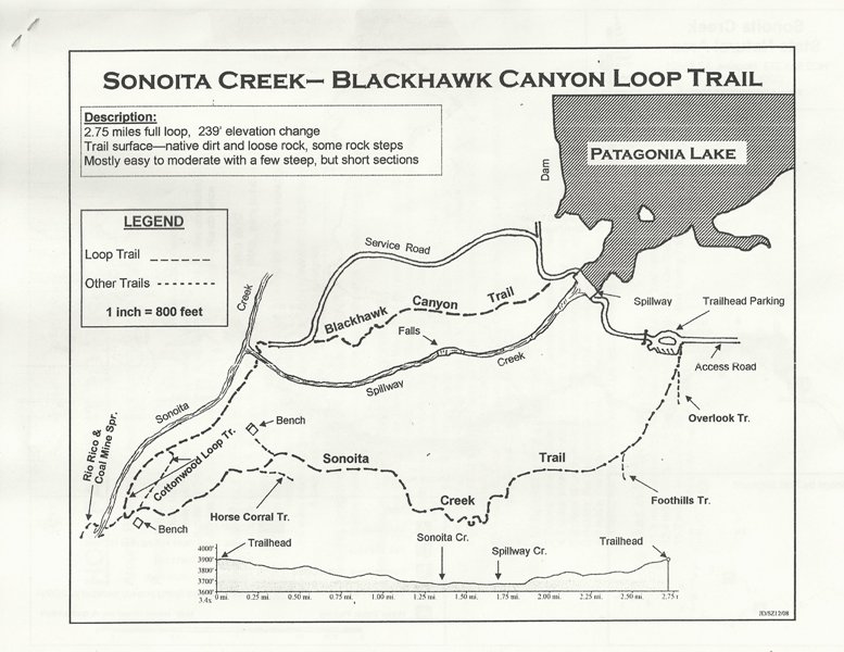 The Sonoita Creek Natural Area has a number of trails that are well marked in some areas and not so well marked in others. Hikers should be prepared to cross the stream and to hike in close proximity to grazing cattle. Basically, the hike involves hiking down to the stream from the trailhead-parking area, following allow the stream for a ways and then circling around and returning to the trailhead-parking area by another trail. One way is to hike down the service road and cross the spillway of the dam to rejoin the service road on the other side. After a short walk one will see the sign for the Blackhawk Trail on the left. If one goes down the Blackhawk Trail and returns on the Sonoita Creek Trail, the distance is about 2.75 miles (see the Trail Map). However, it is easy to make the hike longer by simply following the creek a little longer before turning back. The stream is pretty and the water is a bird magnet that attracts more birds than are usually seen hiking in the desert. The total elevation loss and then gain is about 240 feet verticle. Much of the hike is relatively level but there are sections where the climbing will be very noticeable. There is some up and down. The author of this page would describe the hike as easy with some moderate sections while climbing.